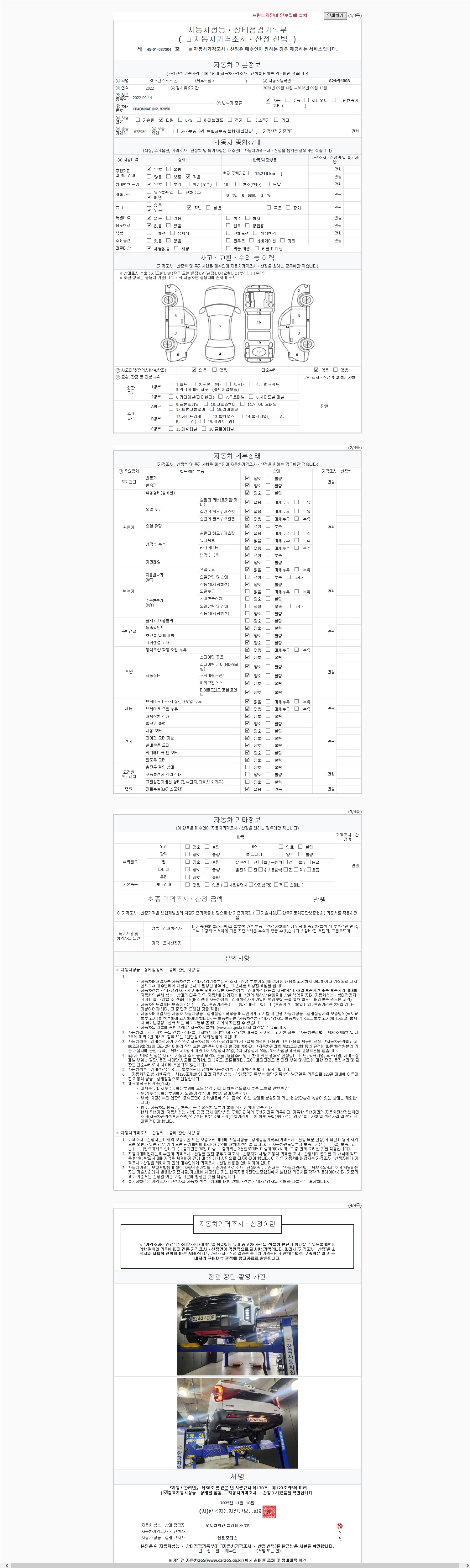 자동차관리법 시행규칙 제120조의 규정에 따라 별지 제 82호서식 《중고자동차 성능, 상태점검 기록부》를 발행한 성능, 상태점검자 및 매매자는 아래의 보증기간 또는 보증거리 이내의 중고자동차, 성능점검 기록부에 기재된 내용과 자동차의 실제 성능, 상태가 다른 경우 계약 또는 관계법령에 따라 매수인에 대하여 책임을 집니다.