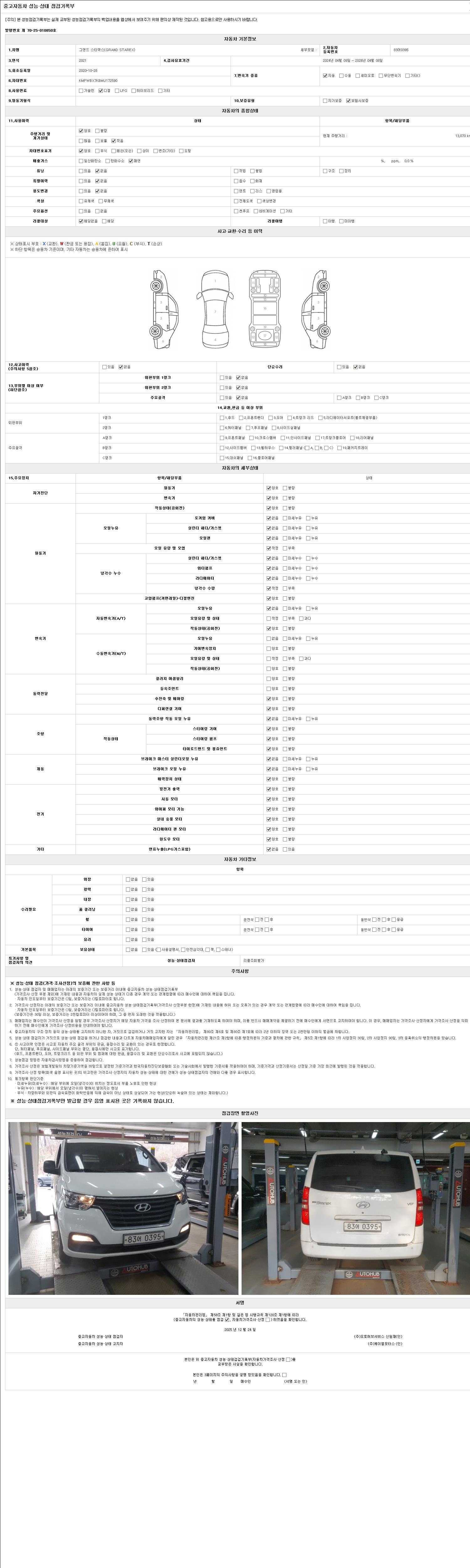 자동차관리법 시행규칙 제120조의 규정에 따라 별지 제 82호서식 《중고자동차 성능, 상태점검 기록부》를 발행한 성능, 상태점검자 및 매매자는 아래의 보증기간 또는 보증거리 이내의 중고자동차, 성능점검 기록부에 기재된 내용과 자동차의 실제 성능, 상태가 다른 경우 계약 또는 관계법령에 따라 매수인에 대하여 책임을 집니다.