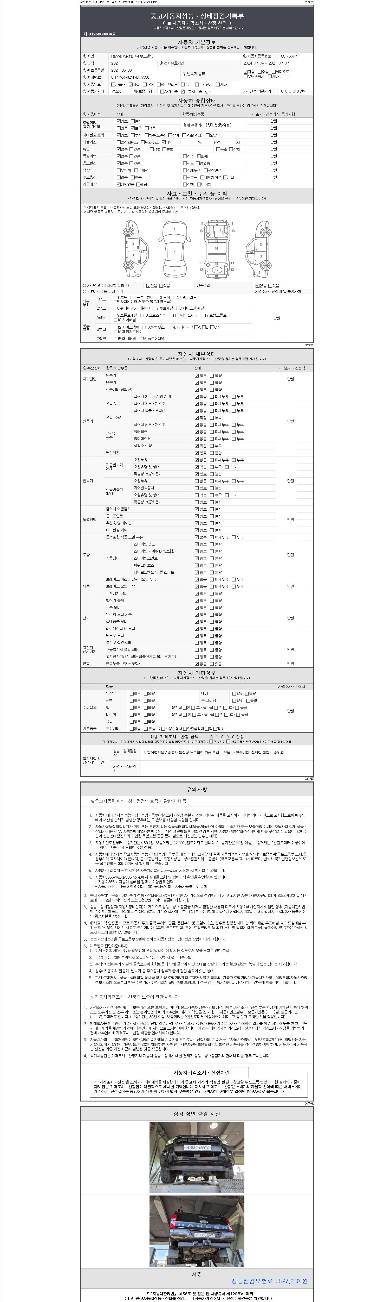 자동차관리법 시행규칙 제120조의 규정에 따라 별지 제 82호서식 《중고자동차 성능, 상태점검 기록부》를 발행한 성능, 상태점검자 및 매매자는 아래의 보증기간 또는 보증거리 이내의 중고자동차, 성능점검 기록부에 기재된 내용과 자동차의 실제 성능, 상태가 다른 경우 계약 또는 관계법령에 따라 매수인에 대하여 책임을 집니다.