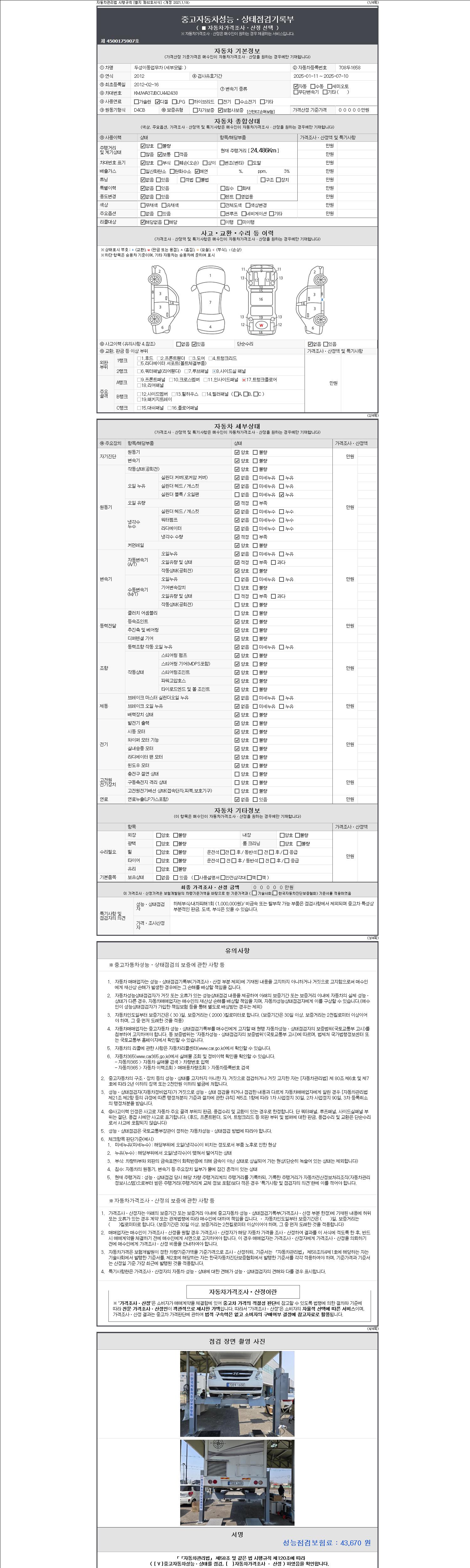 자동차관리법 시행규칙 제120조의 규정에 따라 별지 제 82호서식 《중고자동차 성능, 상태점검 기록부》를 발행한 성능, 상태점검자 및 매매자는 아래의 보증기간 또는 보증거리 이내의 중고자동차, 성능점검 기록부에 기재된 내용과 자동차의 실제 성능, 상태가 다른 경우 계약 또는 관계법령에 따라 매수인에 대하여 책임을 집니다.