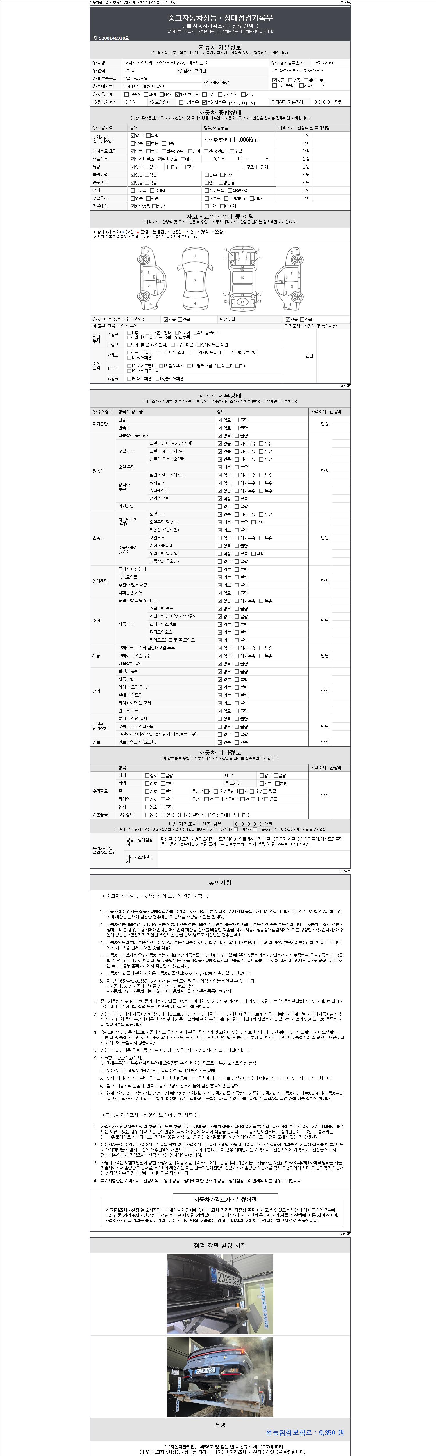 자동차관리법 시행규칙 제120조의 규정에 따라 별지 제 82호서식 《중고자동차 성능, 상태점검 기록부》를 발행한 성능, 상태점검자 및 매매자는 아래의 보증기간 또는 보증거리 이내의 중고자동차, 성능점검 기록부에 기재된 내용과 자동차의 실제 성능, 상태가 다른 경우 계약 또는 관계법령에 따라 매수인에 대하여 책임을 집니다.
