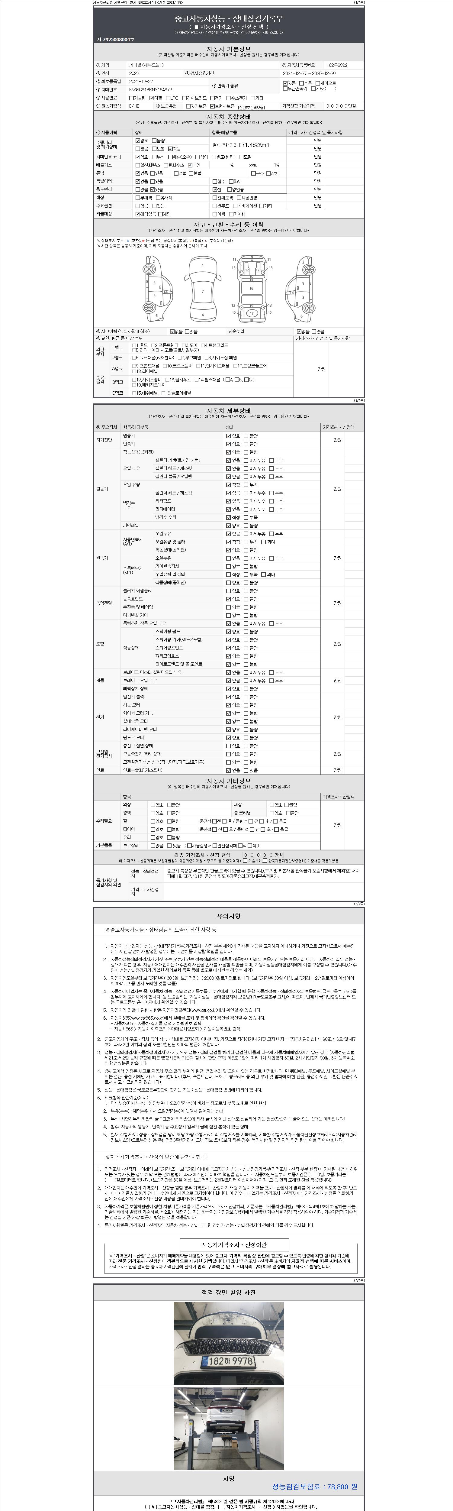 자동차관리법 시행규칙 제120조의 규정에 따라 별지 제 82호서식 《중고자동차 성능, 상태점검 기록부》를 발행한 성능, 상태점검자 및 매매자는 아래의 보증기간 또는 보증거리 이내의 중고자동차, 성능점검 기록부에 기재된 내용과 자동차의 실제 성능, 상태가 다른 경우 계약 또는 관계법령에 따라 매수인에 대하여 책임을 집니다.