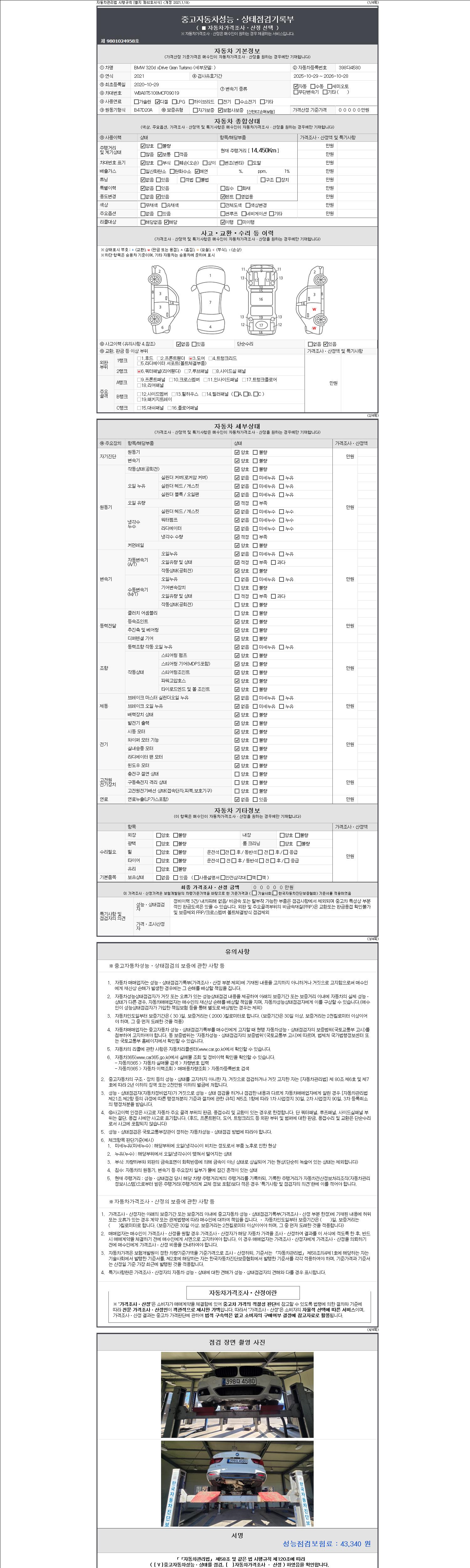 자동차관리법 시행규칙 제120조의 규정에 따라 별지 제 82호서식 《중고자동차 성능, 상태점검 기록부》를 발행한 성능, 상태점검자 및 매매자는 아래의 보증기간 또는 보증거리 이내의 중고자동차, 성능점검 기록부에 기재된 내용과 자동차의 실제 성능, 상태가 다른 경우 계약 또는 관계법령에 따라 매수인에 대하여 책임을 집니다.