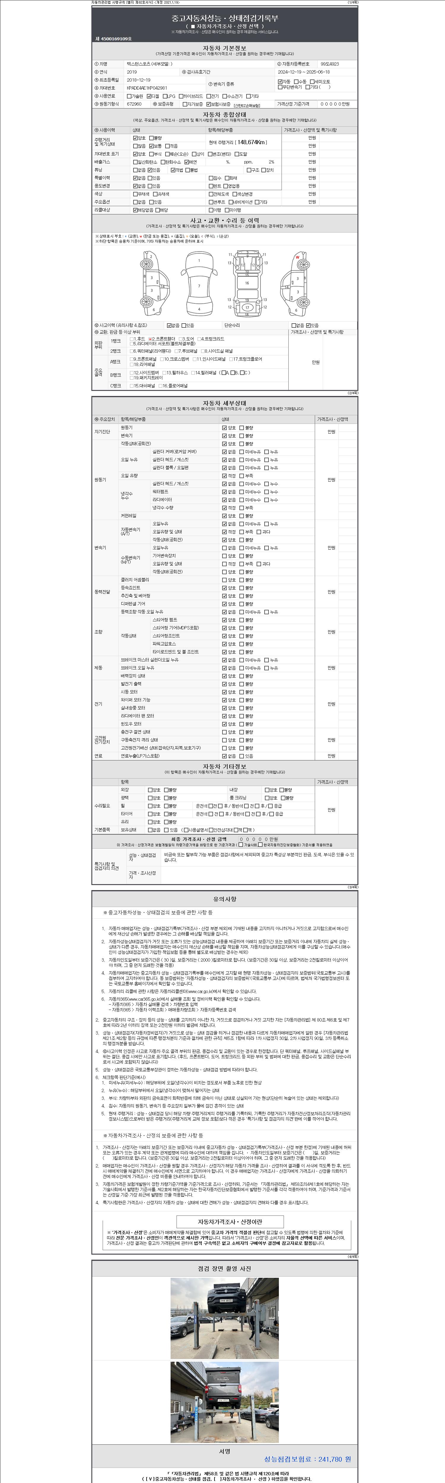 자동차관리법 시행규칙 제120조의 규정에 따라 별지 제 82호서식 《중고자동차 성능, 상태점검 기록부》를 발행한 성능, 상태점검자 및 매매자는 아래의 보증기간 또는 보증거리 이내의 중고자동차, 성능점검 기록부에 기재된 내용과 자동차의 실제 성능, 상태가 다른 경우 계약 또는 관계법령에 따라 매수인에 대하여 책임을 집니다.