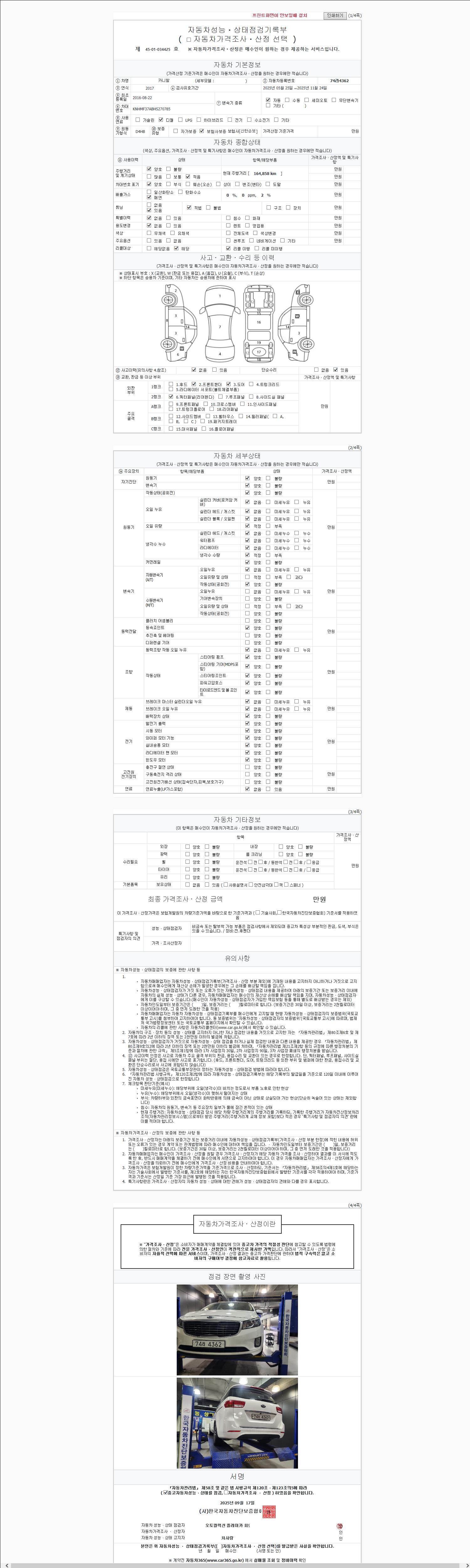 주행거리 164,858 km 차량번호 74라4362