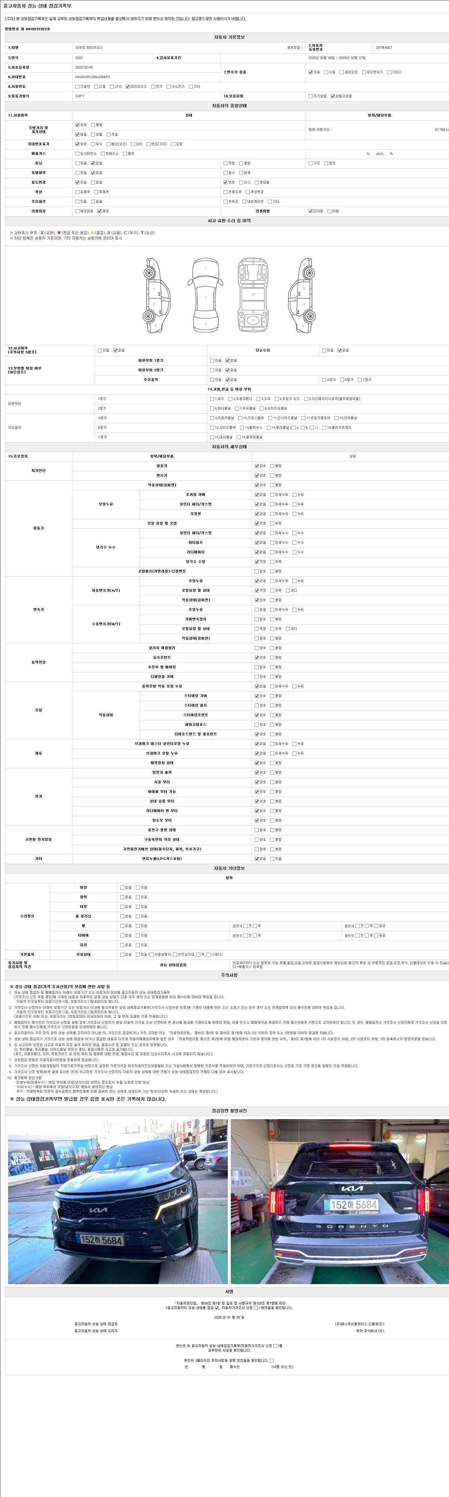 자동차관리법 시행규칙 제120조의 규정에 따라 별지 제 82호서식 《중고자동차 성능, 상태점검 기록부》를 발행한 성능, 상태점검자 및 매매자는 아래의 보증기간 또는 보증거리 이내의 중고자동차, 성능점검 기록부에 기재된 내용과 자동차의 실제 성능, 상태가 다른 경우 계약 또는 관계법령에 따라 매수인에 대하여 책임을 집니다.