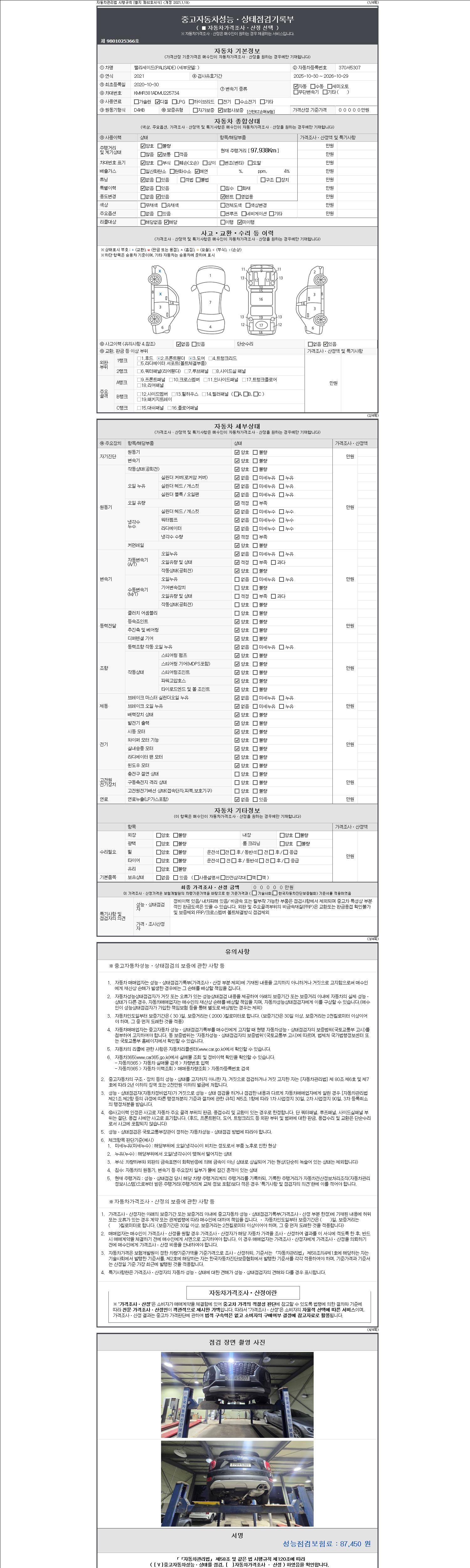 -중고자동차 매매업자를 통해 차량을 구입하실 경우 반드시 "중고자동차 성능, 상태점검 기록부"를 교뷰 받으셔야 하며, 매매업자는 반드시 의무 교부 하여야 압니다.