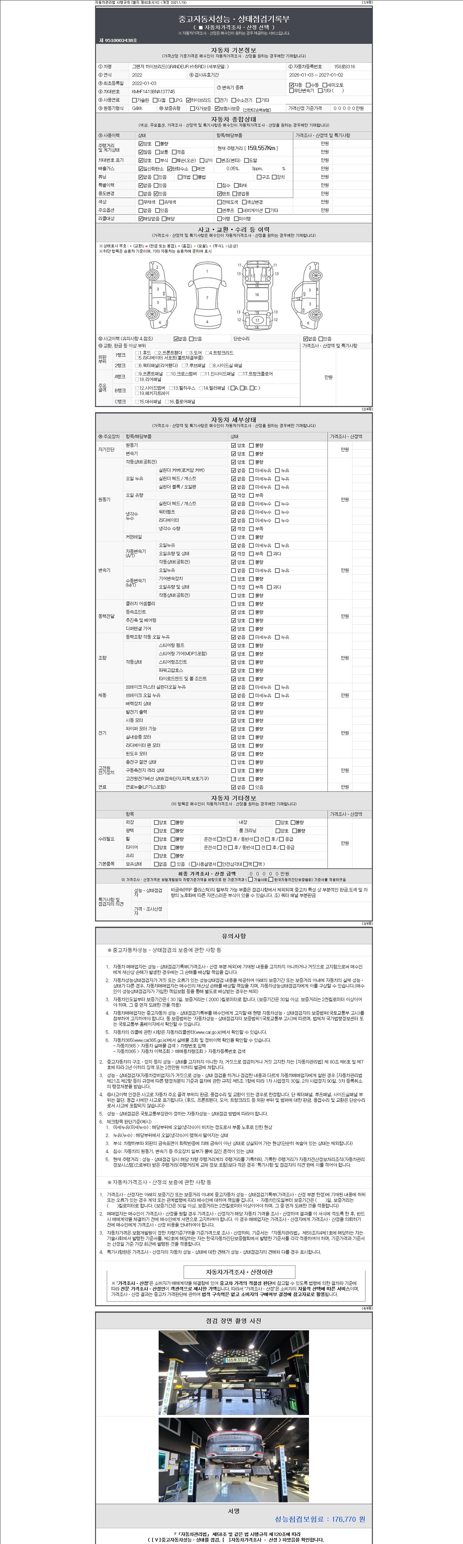 자동차관리법 시행규칙 제120조의 규정에 따라 별지 제 82호서식 《중고자동차 성능, 상태점검 기록부》를 발행한 성능, 상태점검자 및 매매자는 아래의 보증기간 또는 보증거리 이내의 중고자동차, 성능점검 기록부에 기재된 내용과 자동차의 실제 성능, 상태가 다른 경우 계약 또는 관계법령에 따라 매수인에 대하여 책임을 집니다.
