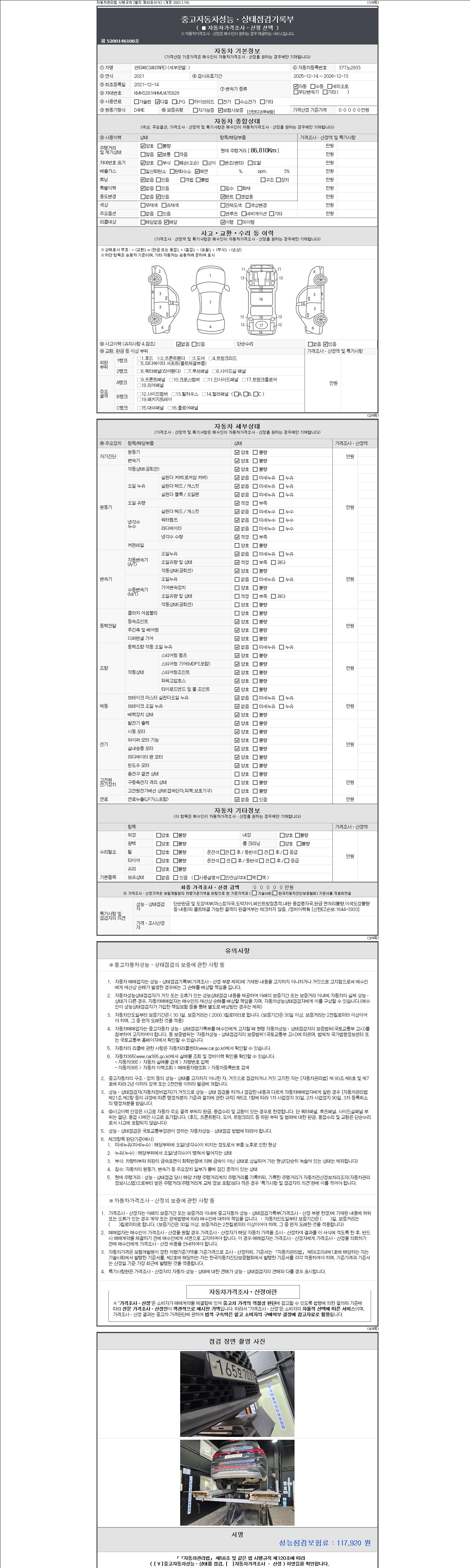 자동차관리법 시행규칙 제120조의 규정에 따라 별지 제 82호서식 《중고자동차 성능, 상태점검 기록부》를 발행한 성능, 상태점검자 및 매매자는 아래의 보증기간 또는 보증거리 이내의 중고자동차, 성능점검 기록부에 기재된 내용과 자동차의 실제 성능, 상태가 다른 경우 계약 또는 관계법령에 따라 매수인에 대하여 책임을 집니다.