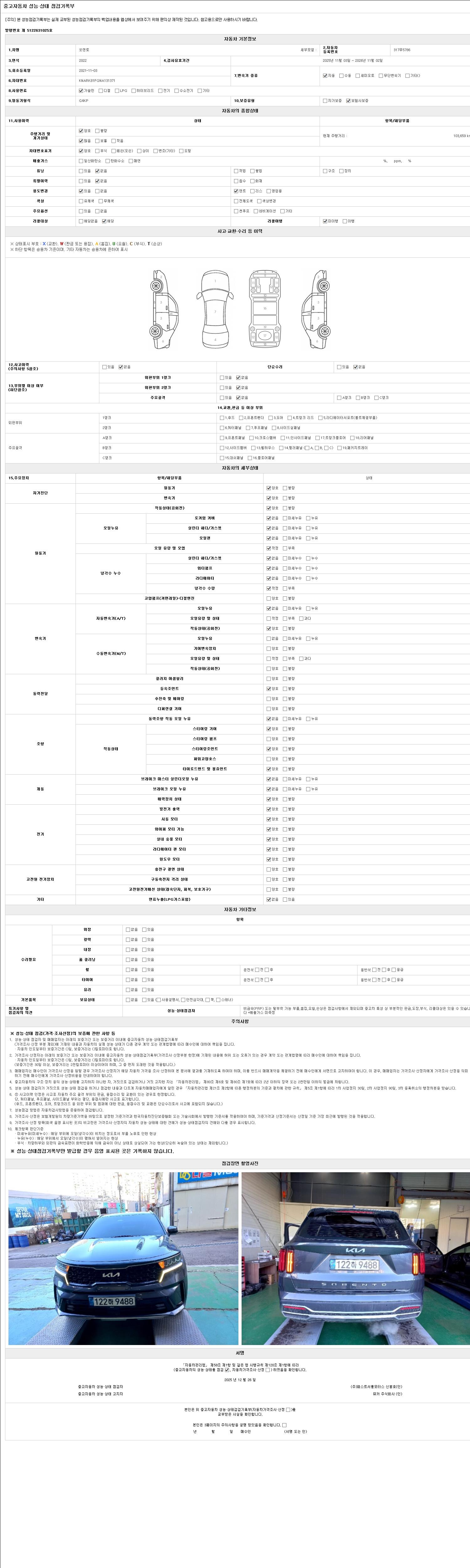 -중고자동차 매매업자를 통해 차량을 구입하실 경우 반드시 "중고자동차 성능, 상태점검 기록부"를 교뷰 받으셔야 하며, 매매업자는 반드시 의무 교부 하여야 압니다.