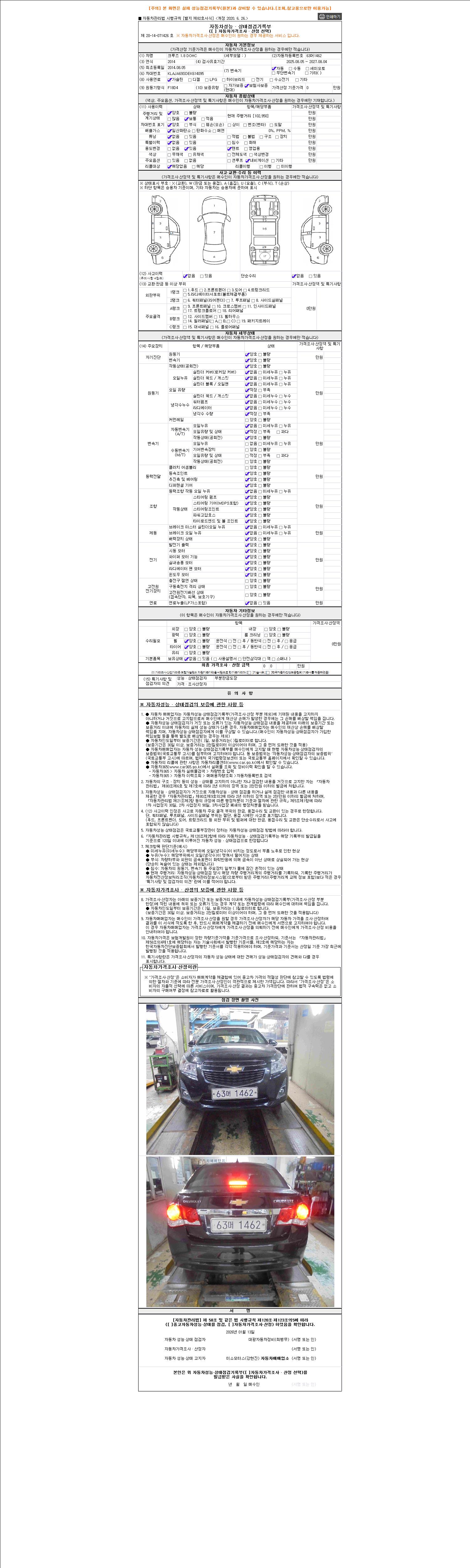 자동차관리법 시행규칙 제120조의 규정에 따라 별지 제 82호서식 《중고자동차 성능, 상태점검 기록부》를 발행한 성능, 상태점검자 및 매매자는 아래의 보증기간 또는 보증거리 이내의 중고자동차, 성능점검 기록부에 기재된 내용과 자동차의 실제 성능, 상태가 다른 경우 계약 또는 관계법령에 따라 매수인에 대하여 책임을 집니다.