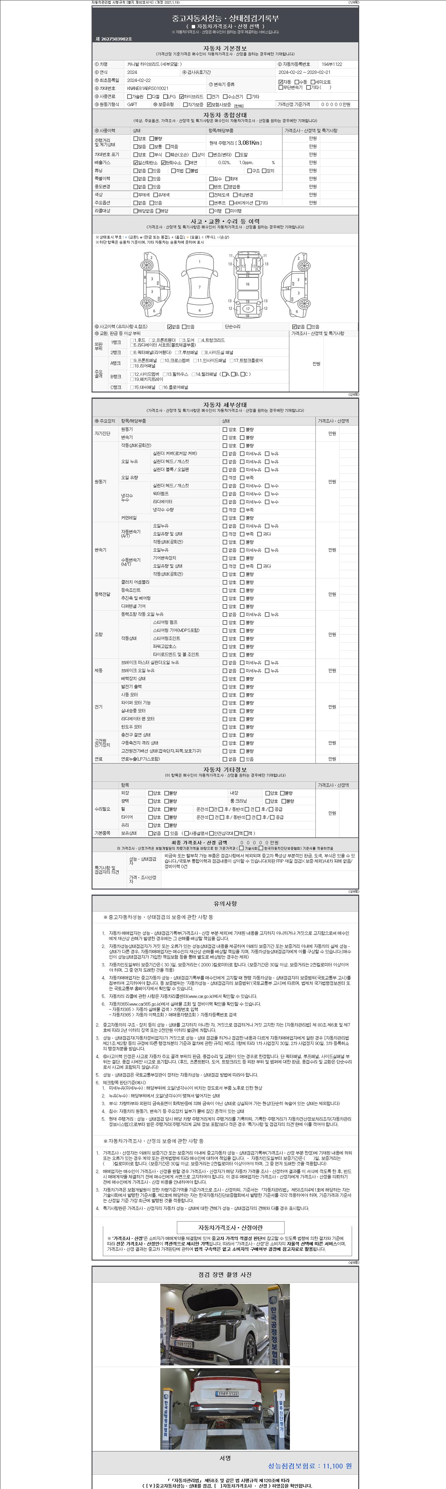 자동차관리법 시행규칙 제120조의 규정에 따라 별지 제 82호서식 《중고자동차 성능, 상태점검 기록부》를 발행한 성능, 상태점검자 및 매매자는 아래의 보증기간 또는 보증거리 이내의 중고자동차, 성능점검 기록부에 기재된 내용과 자동차의 실제 성능, 상태가 다른 경우 계약 또는 관계법령에 따라 매수인에 대하여 책임을 집니다.