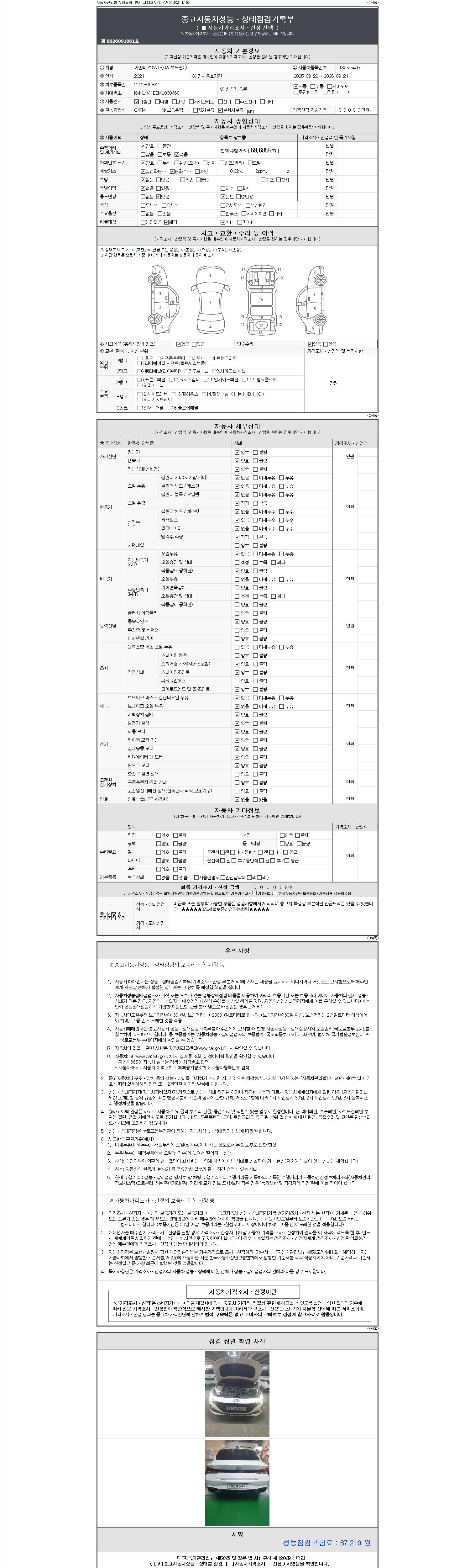 | 주행거리 | 69,685 km | 차량번호 | 182서5497 | 사고유무 | 성능기록부 참조 | 제시번호 | 제 2147483647 호 |