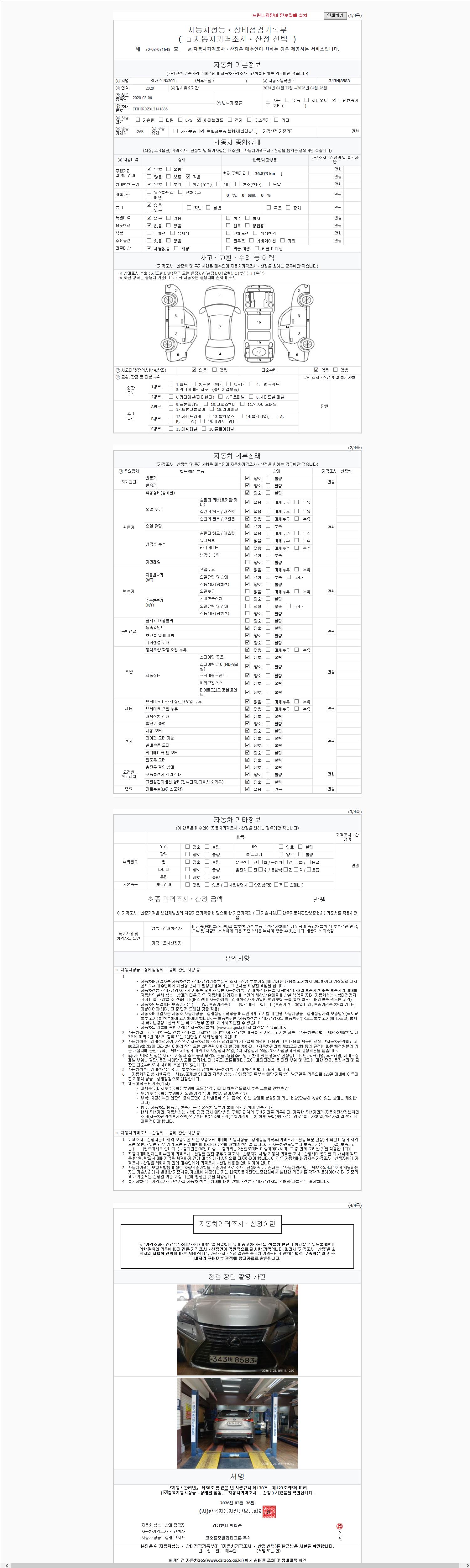 | 주행거리 | 36,880 km | 차량번호 | 343버8583 | 사고유무 | 성능기록부 참조 | 제시번호 | 제 2147483647 호 |