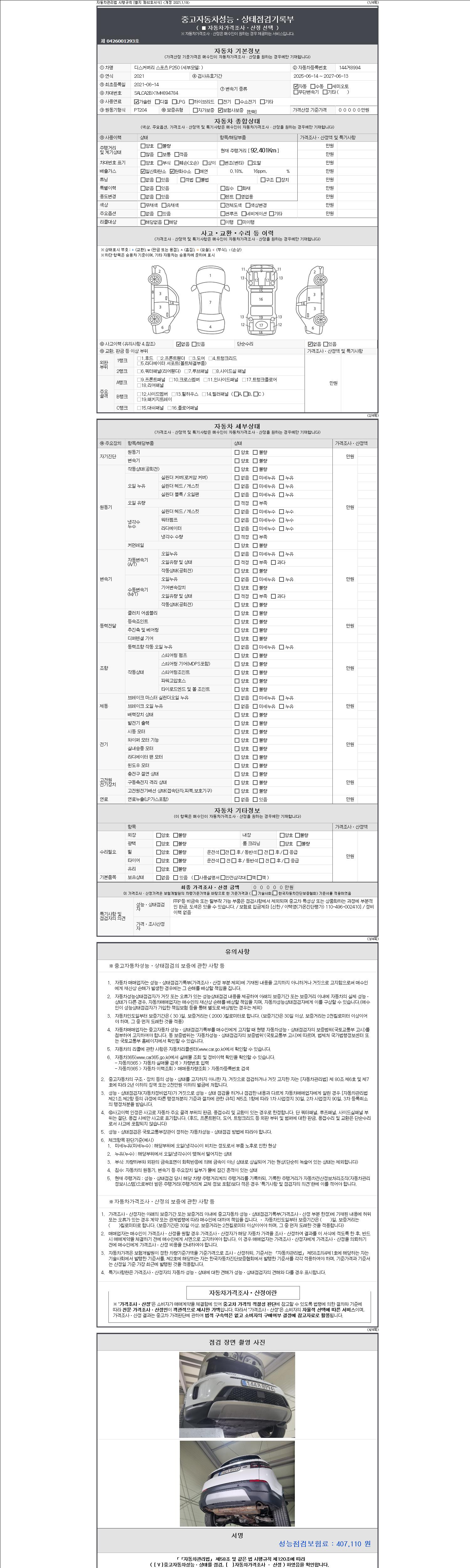 | 주행거리 | 92,401 km | 차량번호 | 144거8994 | 사고유무 | 성능기록부 참조 | 제시번호 | 제 2147483647 호 |