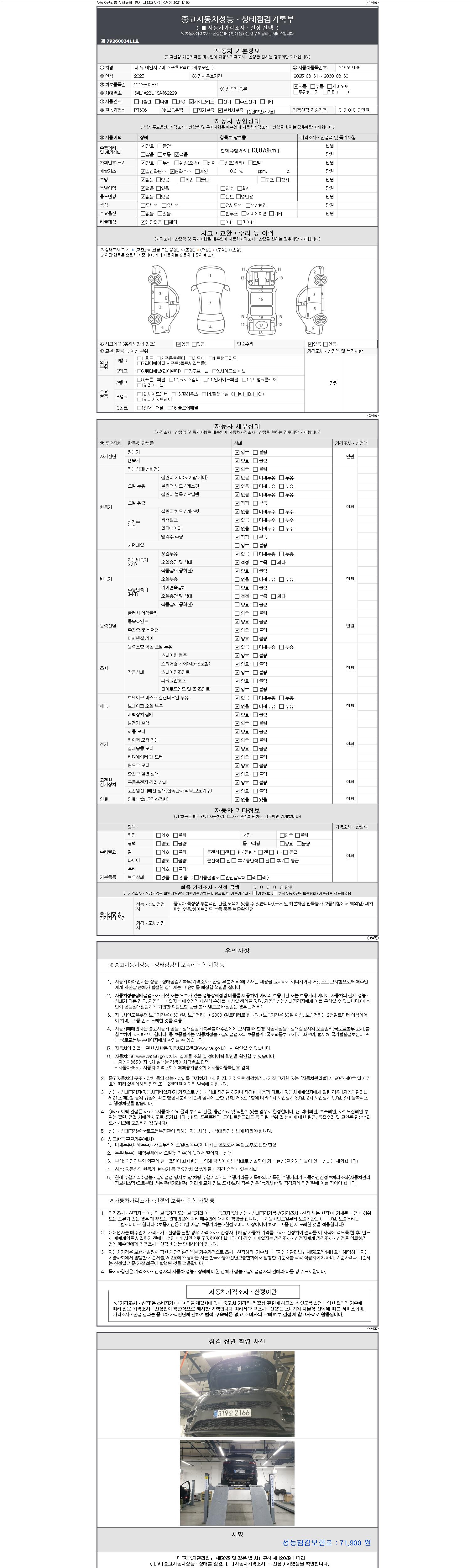 | 주행거리 | 13,878 km | 차량번호 | 319오2166 | 사고유무 | 성능기록부 참조 | 제시번호 | 제 2147483647 호 |