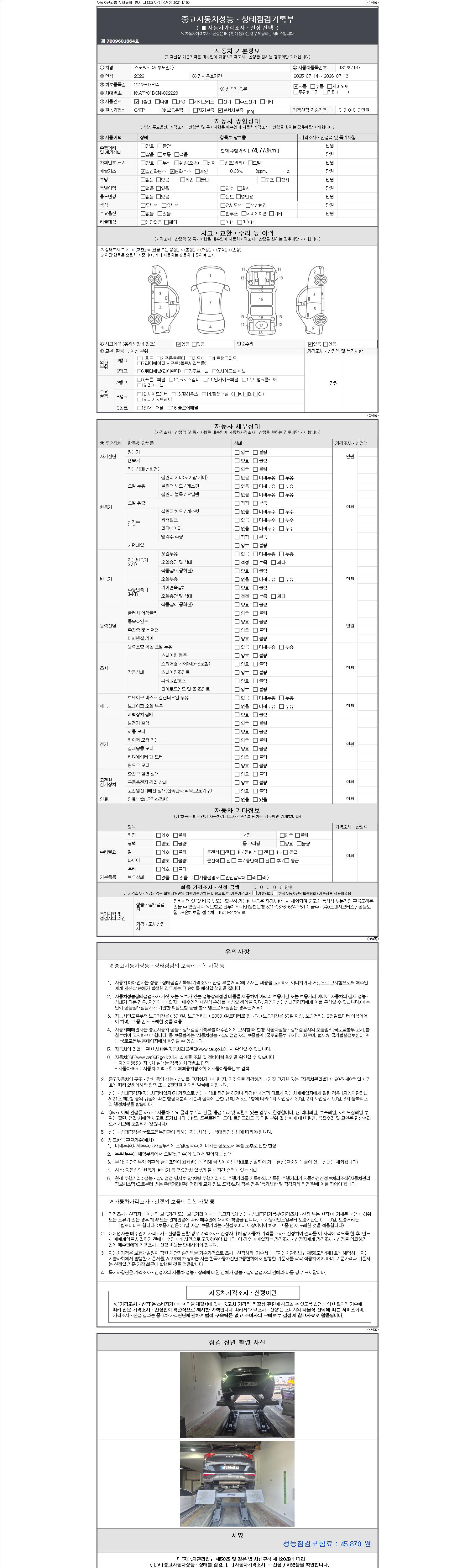 자동차관리법 시행규칙 제120조의 규정에 따라 별지 제 82호서식 《중고자동차 성능, 상태점검 기록부》를 발행한 성능, 상태점검자 및 매매자는 아래의 보증기간 또는 보증거리 이내의 중고자동차, 성능점검 기록부에 기재된 내용과 자동차의 실제 성능, 상태가 다른 경우 계약 또는 관계법령에 따라 매수인에 대하여 책임을 집니다.