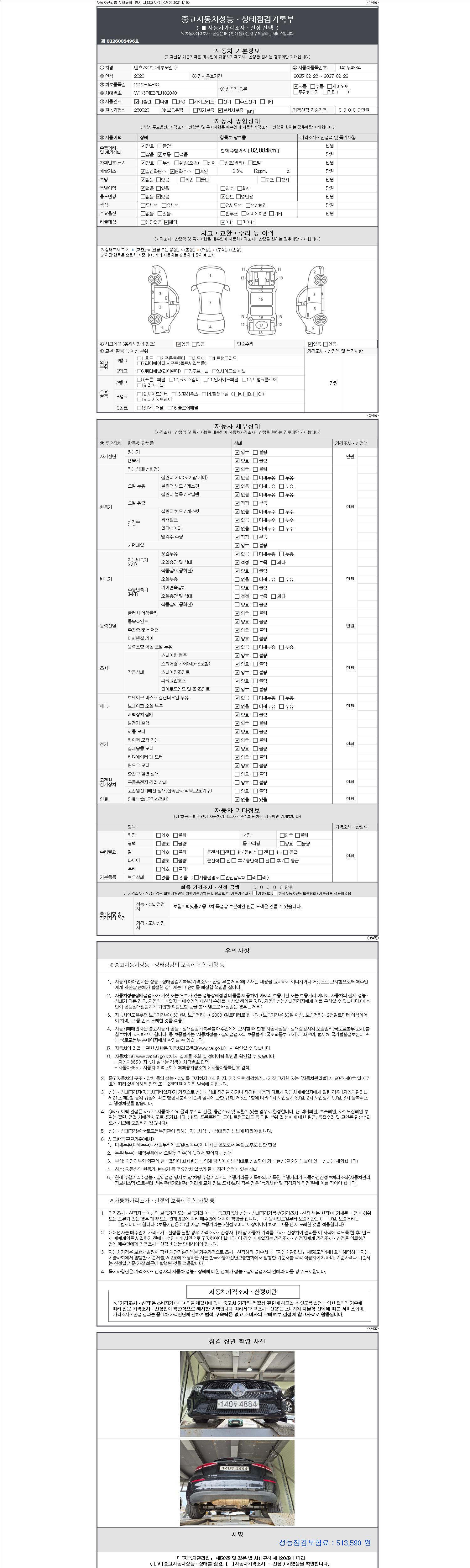자동차관리법 시행규칙 제120조의 규정에 따라 별지 제 82호서식 《중고자동차 성능, 상태점검 기록부》를 발행한 성능, 상태점검자 및 매매자는 아래의 보증기간 또는 보증거리 이내의 중고자동차, 성능점검 기록부에 기재된 내용과 자동차의 실제 성능, 상태가 다른 경우 계약 또는 관계법령에 따라 매수인에 대하여 책임을 집니다.