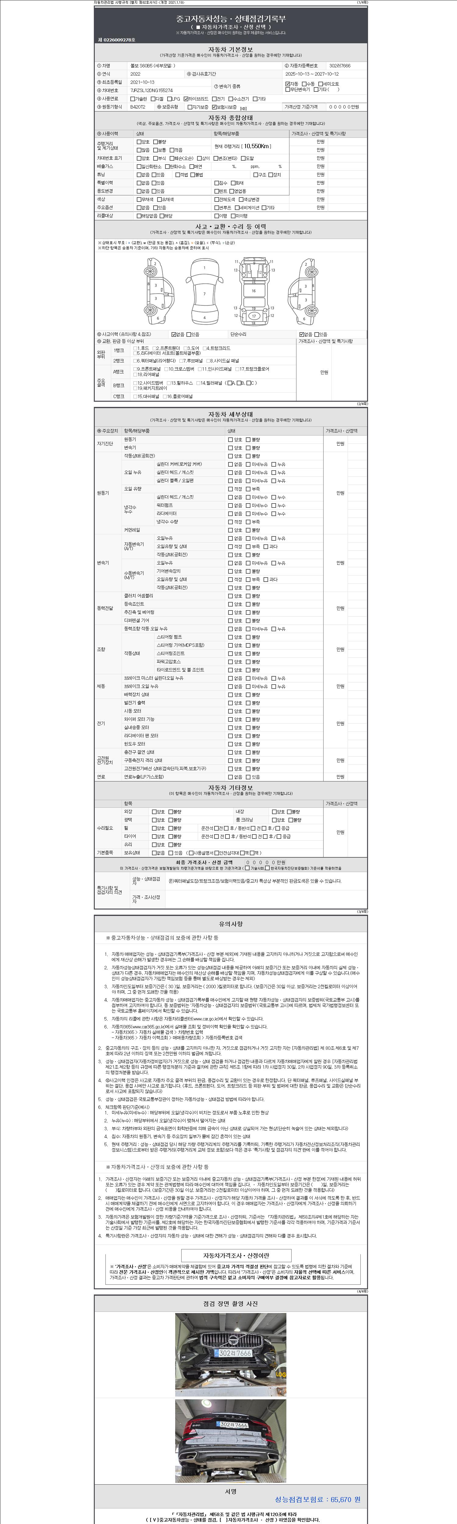 | 주행거리 | 10,550 km | 차량번호 | 302러7666 | 사고유무 | 성능기록부 참조 | 제시번호 | 제 2147483647 호 |