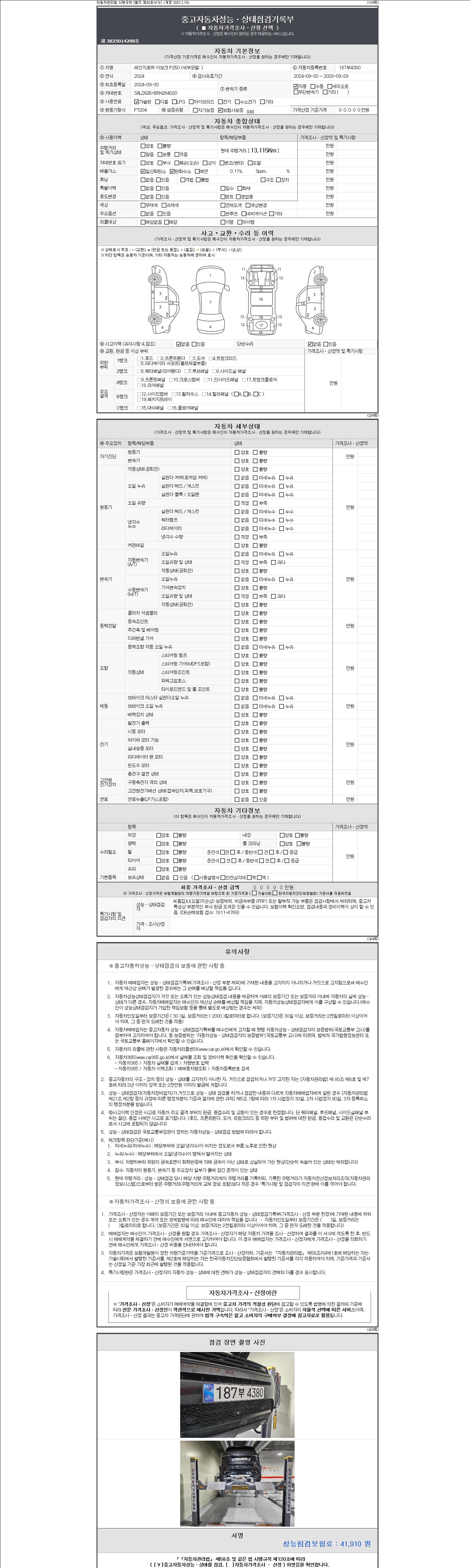 | 주행거리 | 13,115 km | 차량번호 | 187부4380 | 사고유무 | 성능기록부 참조 | 제시번호 | 제 2147483647 호 |