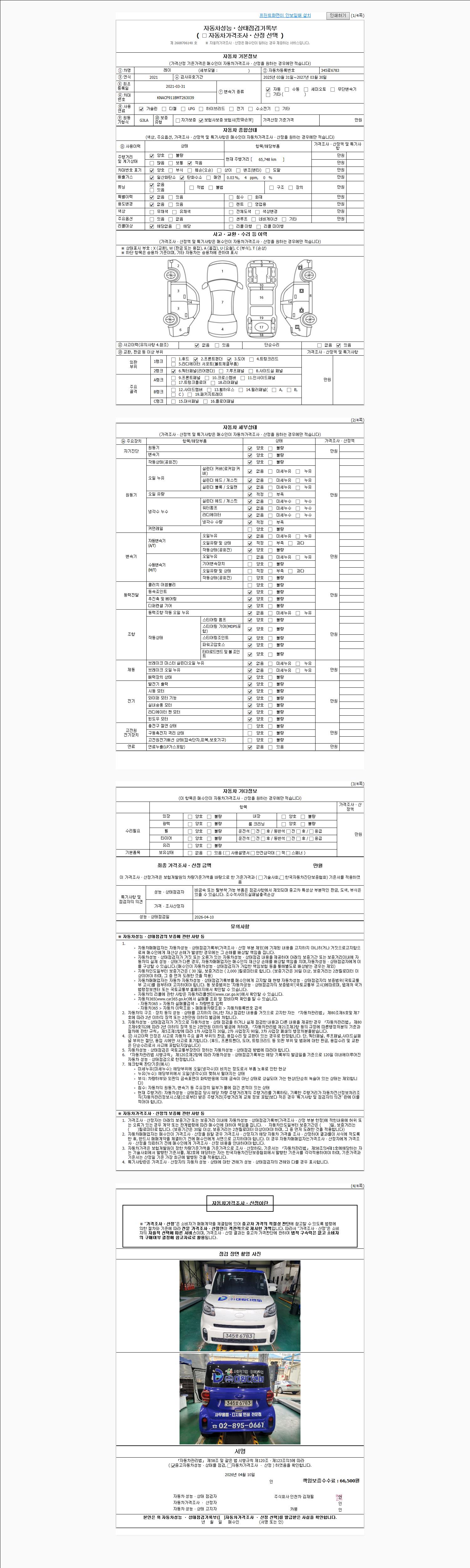 | 주행거리 | 65,748 km | 차량번호 | 345로6783 | 사고유무 | 성능기록부 참조 | 제시번호 | 제 2026018940 호 |
