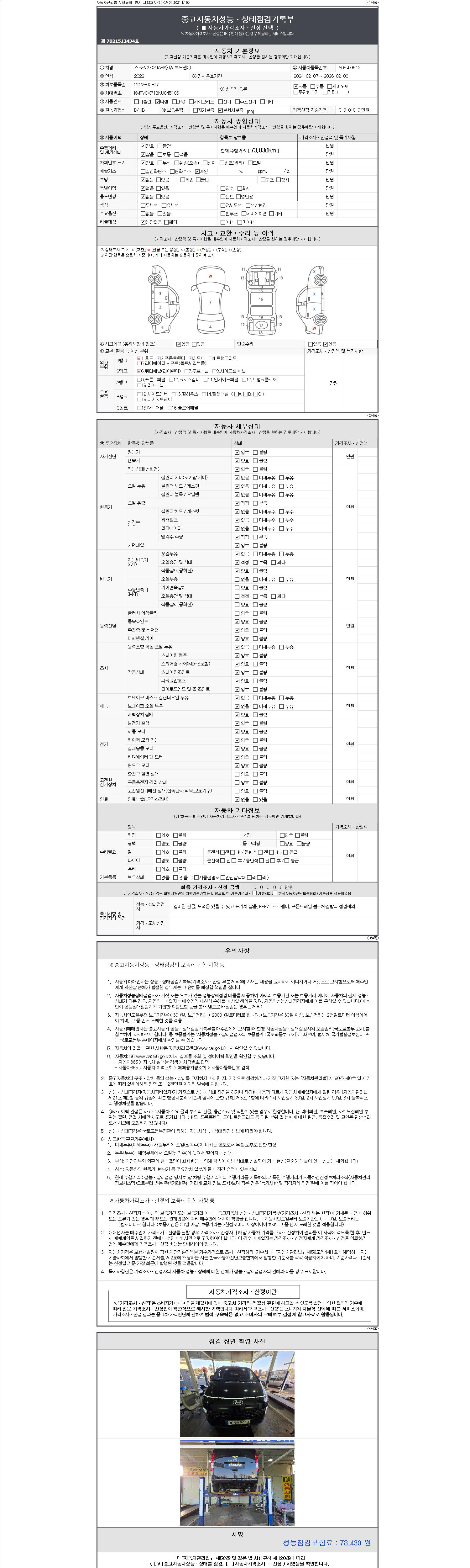 자동차관리법 시행규칙 제120조의 규정에 따라 별지 제 82호서식 《중고자동차 성능, 상태점검 기록부》를 발행한 성능, 상태점검자 및 매매자는 아래의 보증기간 또는 보증거리 이내의 중고자동차, 성능점검 기록부에 기재된 내용과 자동차의 실제 성능, 상태가 다른 경우 계약 또는 관계법령에 따라 매수인에 대하여 책임을 집니다.