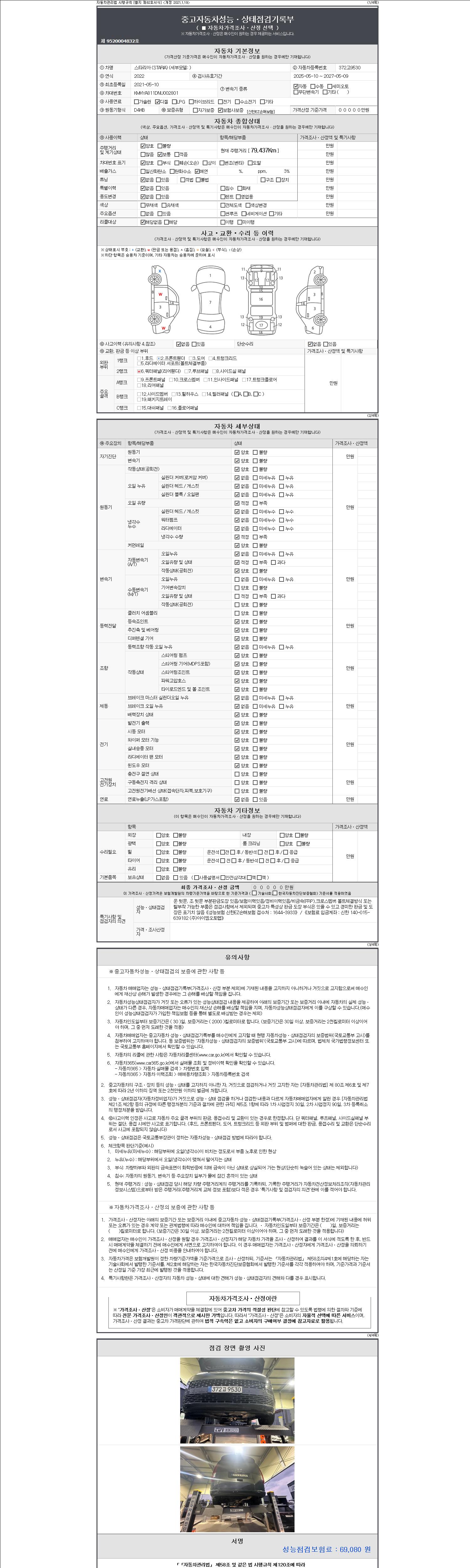 -중고자동차 매매업자를 통해 차량을 구입하실 경우 반드시 "중고자동차 성능, 상태점검 기록부"를 교뷰 받으셔야 하며, 매매업자는 반드시 의무 교부 하여야 압니다.