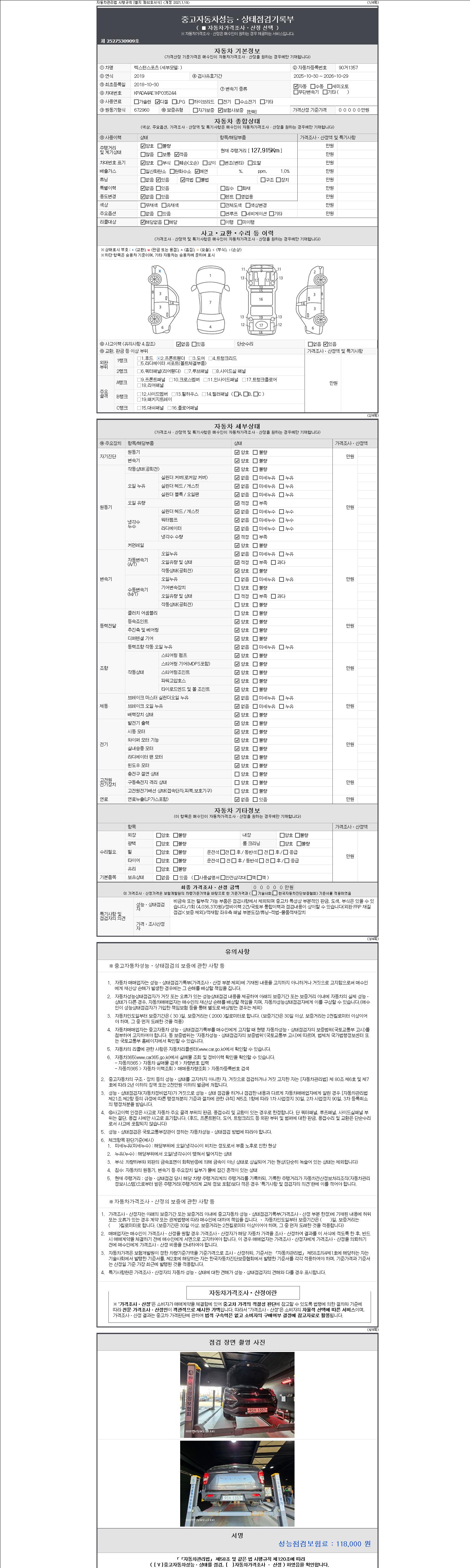 자동차관리법 시행규칙 제120조의 규정에 따라 별지 제 82호서식 《중고자동차 성능, 상태점검 기록부》를 발행한 성능, 상태점검자 및 매매자는 아래의 보증기간 또는 보증거리 이내의 중고자동차, 성능점검 기록부에 기재된 내용과 자동차의 실제 성능, 상태가 다른 경우 계약 또는 관계법령에 따라 매수인에 대하여 책임을 집니다.