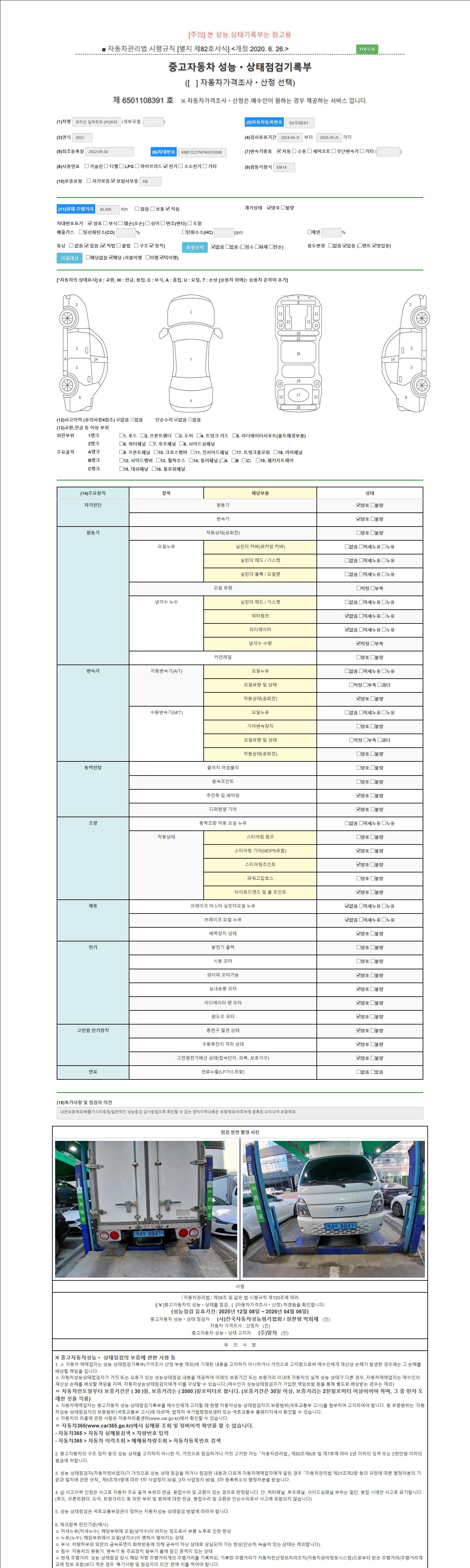 자동차관리법 시행규칙 제120조의 규정에 따라 별지 제 82호서식 《중고자동차 성능, 상태점검 기록부》를 발행한 성능, 상태점검자 및 매매자는 아래의 보증기간 또는 보증거리 이내의 중고자동차, 성능점검 기록부에 기재된 내용과 자동차의 실제 성능, 상태가 다른 경우 계약 또는 관계법령에 따라 매수인에 대하여 책임을 집니다.