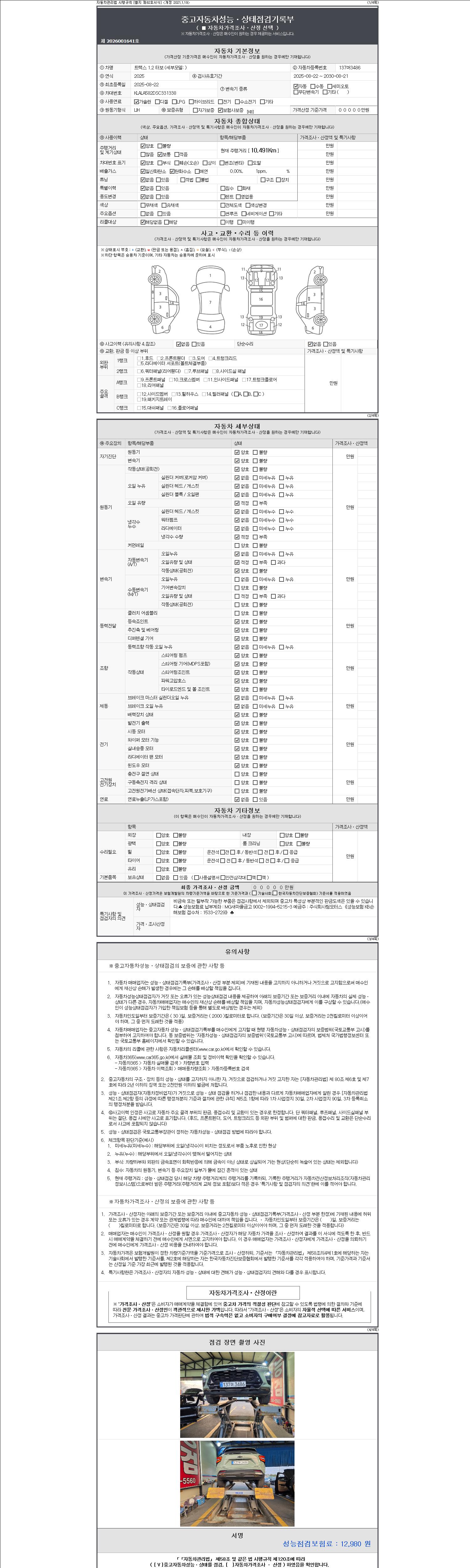자동차관리법 시행규칙 제120조의 규정에 따라 별지 제 82호서식 《중고자동차 성능, 상태점검 기록부》를 발행한 성능, 상태점검자 및 매매자는 아래의 보증기간 또는 보증거리 이내의 중고자동차, 성능점검 기록부에 기재된 내용과 자동차의 실제 성능, 상태가 다른 경우 계약 또는 관계법령에 따라 매수인에 대하여 책임을 집니다.